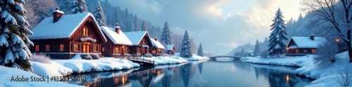 © Phennapha, Fototapeta premium Snowy village scene with festive buildings and icy pond, house, christmas, snowy