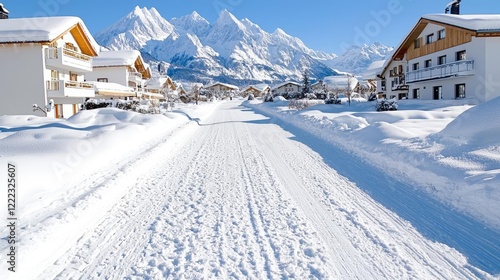 Fototapeta premium Snowy village street, Alps mountain view, winter vacation