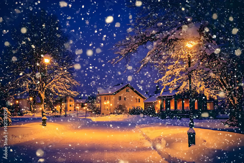 Naklejka premium Snowy Village Street at Night with Warm Lights and Falling Snow