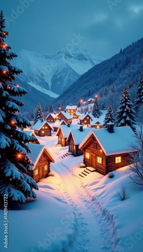 © Prayad, Fototapeta premium Snowy village with golden lights against a white snowy background, snowy landscape, festive atmosphere, cozy scene