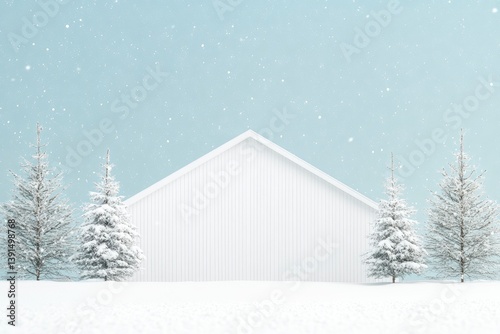 Naklejka premium Snowy White Barn and Trees in Winter Landscape with Falling Snow