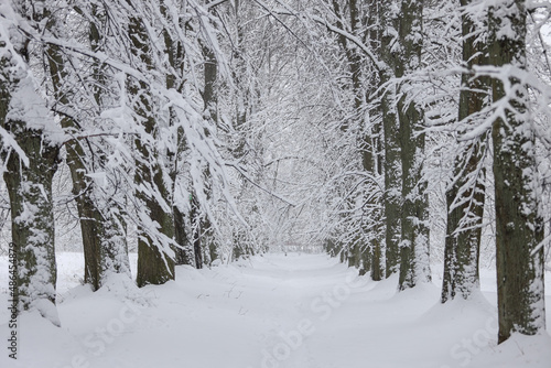 Fototapeta premium Snowy white winter landscape view with forest pedestrian trail.