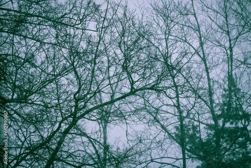 © pictures_for_you, Fototapeta premium Snowy winter background with trees. Wintertime nature details.