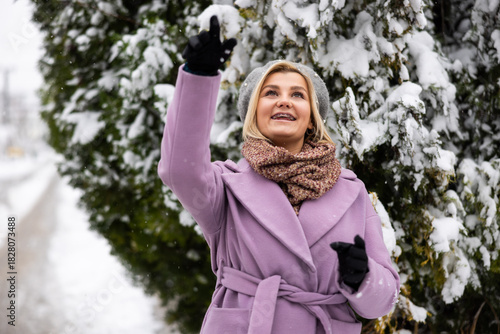 © Branka, Obraz premium Snowy winter day in a park with a woman enjoying the snowfall while wearing warm clothing