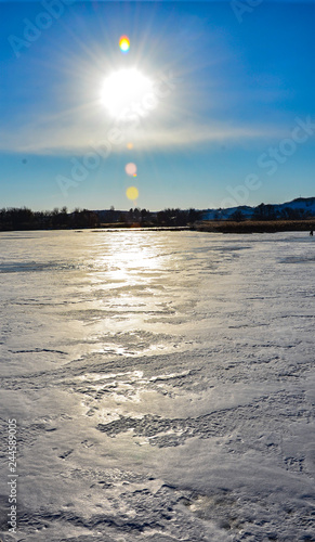 Fototapeta premium snowy winter day outdoor. ice-bound lake with blue sky and bright sun over it.