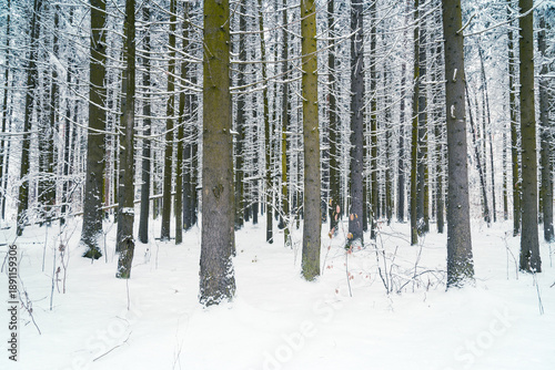 Fototapeta premium Snowy winter forest background. Spruce trees' trunks are covered with snow.