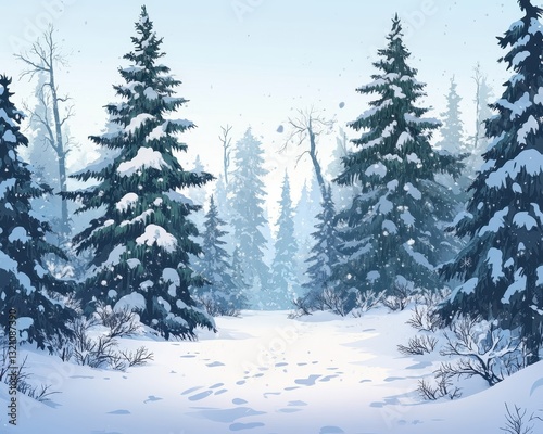 Naklejka premium Snowy Winter Forest Landscape with Evergreen Trees and Fresh Snowfall, Vector...