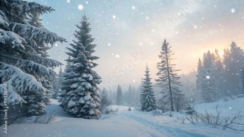 Naklejka premium Snowy Winter Forest Path Sunrise, Snowfall, Coniferous Trees, Landscape...