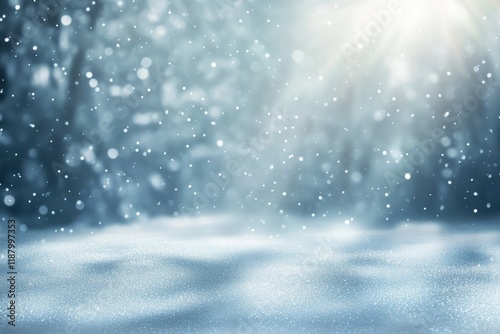 Fototapeta premium Snowy winter forest scene, sunlight, snowfall, background, holiday