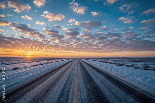 © NFTNexus, Fototapeta premium Snowy winter highway under a colorful evening sky with clouds