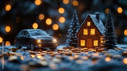 © TITISCAHYA, Naklejka premium Snowy winter home, car, coins, lights, finance