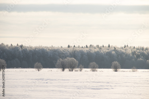 Fototapeta premium Snowy winter landscape in the field. Frozen white trees. Russian open spaces.