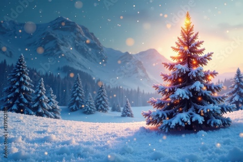 © Phennapha, Naklejka premium Snowy winter landscape with Christmas tree, icy , snowflakes