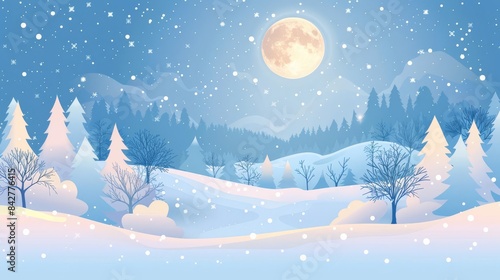 Naklejka premium Snowy winter landscape with full moon and pine trees.