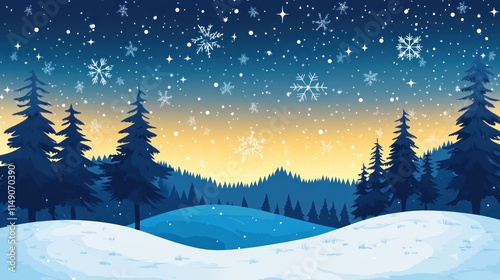 Naklejka premium Snowy winter landscape with pine trees, hills, and falling snowflakes under a starry night sky.