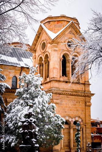 © Jim Ekstrand, Fototapeta premium Snowy winter scene in Santa Fe, vertical view of church and trees
