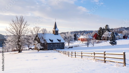 Fototapeta premium Snowy Winter Scene: Rustic Church, Red Barn, and Frosty Trees