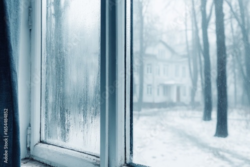 © YOGA, Obraz premium Snowy winter scene viewed through a frosty window