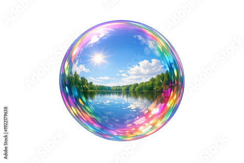 © PNG Kingdom , Fototapeta premium Soap bubble capturing a serene lake landscape with green trees, bright blue sky, sunny clouds, and water reflection, transparent background