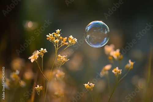 © Archibalttttt, Fototapeta premium Soap bubble floating over wild flowers in meadow