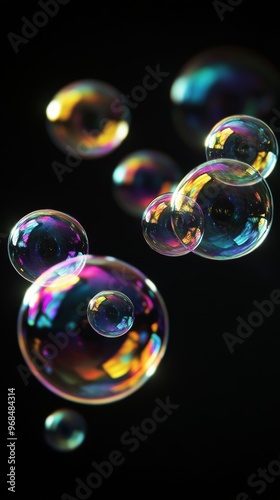 Naklejka premium Soap bubbles with rainbow reflections on black