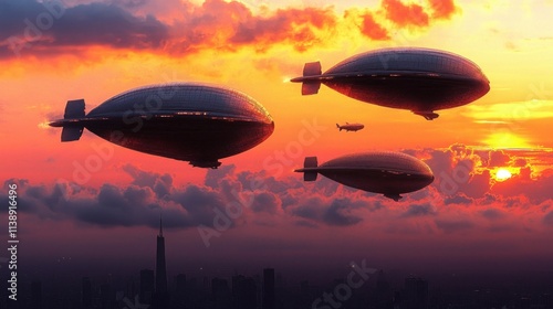 Fototapeta premium Soaring airships at sunset over new york city futuristic scene aerial view urban landscape for adventure seekers
