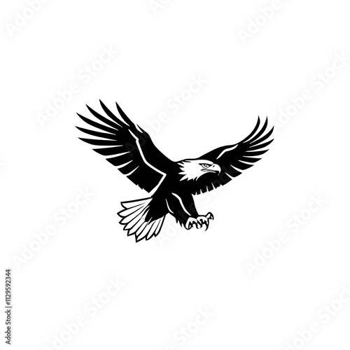 Naklejka premium Soaring Bald Eagle: A powerful black and white silhouette of a bald eagle in flight, symbolizing freedom, strength, and determination.