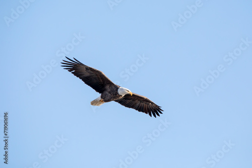 © Katie, Naklejka premium Soaring eagle in the blue sky on a winter day in January in Iowa.