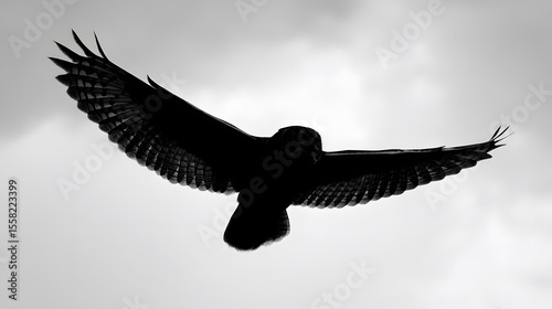 Obraz premium Soaring Silhouette: An owl soars majestically through the sky, its silhouette a striking contrast against the clouds. Capturing the freedom, grace and a moment of silent flight.