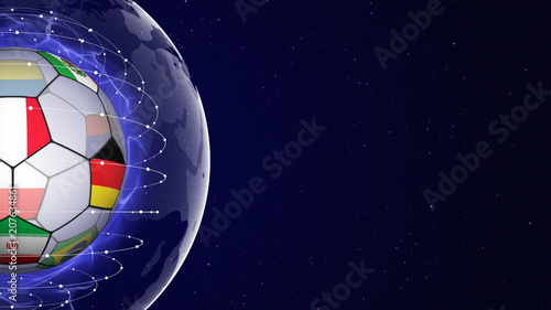 Fototapeta premium Soccer Ball and World Cup Team Flags in Blue Abstract Particles Ring, Background