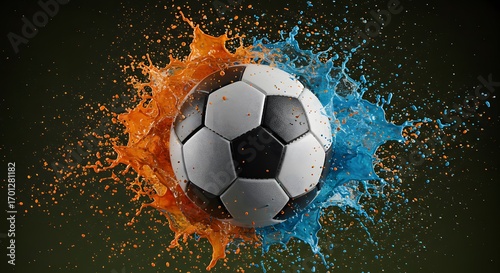 Fototapeta premium Soccer ball bursting through orange and blue splashes against dark background