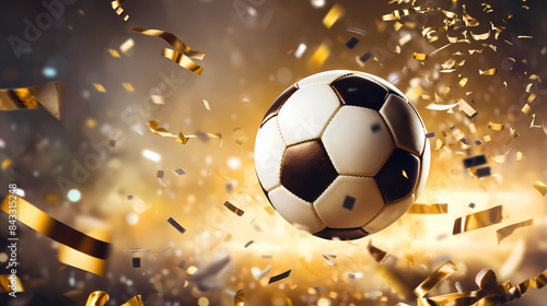 Fototapeta premium Soccer ball flying on background with confetti
