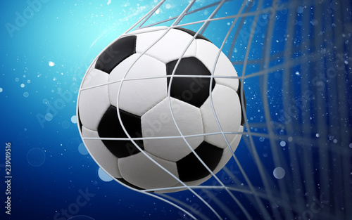 Fototapeta premium Soccer ball in goal on blue