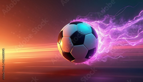 Fototapeta premium Soccer ball in motion with vibrant purple, green light trails. Dynamic movement, speed, energy, power conveyed. Abstract background with blurred streaks, glows. Perfect for sports, gaming, graphic