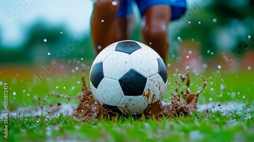 © A4719, Fototapeta premium Soccer Ball in Mud Puddle with Player in Background