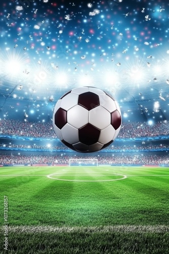 Fototapeta premium Soccer Ball In Shining Stadium, Football Championship, Competition Concept. 3D Illustration