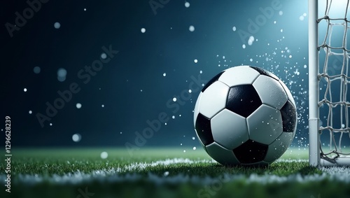 Fototapeta premium Soccer ball in the net, success goal concept on stadium light background