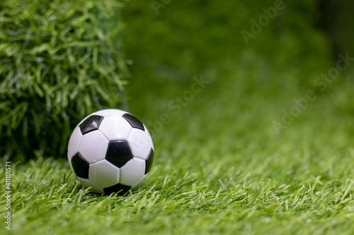 © thaninee, Obraz premium Soccer ball is on green grass background