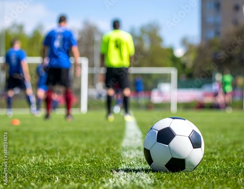 Fototapeta premium Soccer ball on a field with blurred players in the background. Ideal for sports, fitness, and activity themes.