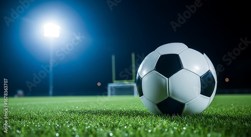 © MdNazim, Obraz premium Soccer ball on a wet grassy field at night football
