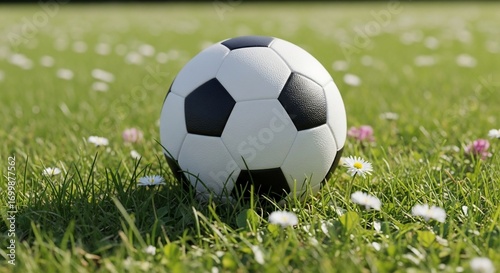 Obraz premium Soccer ball on grass with flowers sports recreation and nature image