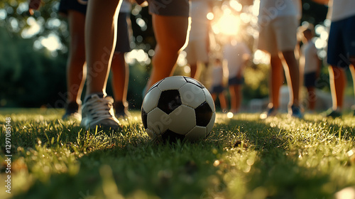 © Evgenia, Fototapeta premium Soccer ball on grass with players in background at sunset