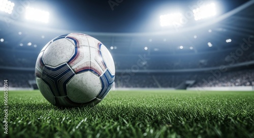 © Naru, Naklejka premium Soccer Ball on Green Field at Night