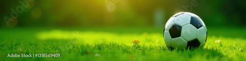 Fototapeta premium Soccer ball on green grass, sports equipment, green grass soccer field, green