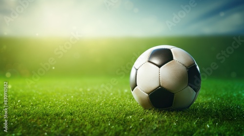 Fototapeta premium soccer ball on soccer field green field and sunlight