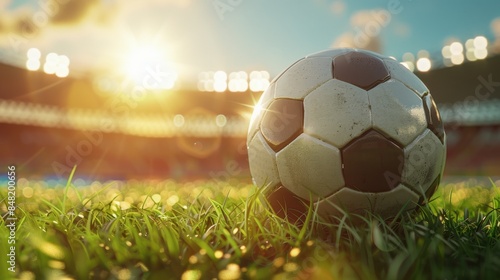 Fototapeta premium Soccer ball on the grass in front of stadium with blurred fans, sunlight and bokeh effect.
