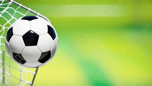 © Vexora, Fototapeta premium Soccer ball resting in the goal, illuminated by sunlight.