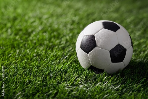 © Oleg, Obraz premium Soccer ball resting on bright green grass ready for play in a sunny afternoon setting
