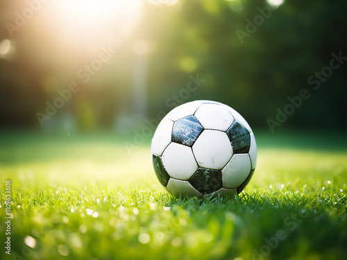 Fototapeta premium Soccer ball resting on the grass in a soccer stadium with background focus
