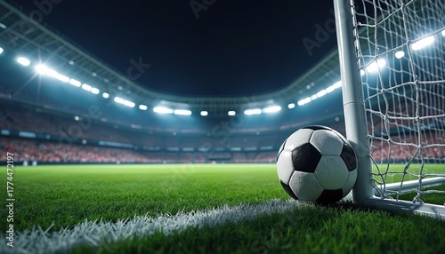 © Vadym, Obraz premium Soccer ball rests near goal net on green grass field in large stadium at night. Bright stadium lights illuminate arena with blurred crowd in background. Game day excitement goal score moment at